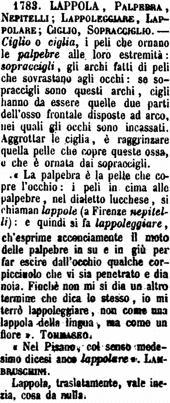 «La palpebra è la pelle che copre l'occhio: i peli in cima alle palpebre, nel dialetto lucchese, si chiaman lappole (a Firenze nepitelli): e quindi si fa lappoleggiare, ch'esprime acconciamente il moto delle palpebre in su e in giù per far escire dall'occhio qualche corpicciuolo che vi sia penetrato e dia noia. Finchè non mi si dia un altro termine che dica lo stesso, io mi terrò lappoleggiare, non come una lappola della lingua, ma come un fiore». Tommaseo.