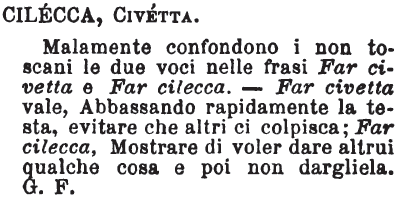 Cilecca, Civetta - Malamente confondono i non toscani le due voci nelle frasi Far civetta e Far cilecca. - Far civetta vale, Abbassando rapidamente la testa, evitare che altri ci colpisca; Far cilecca, Mostrare di voler dare altrui qualche cosa e poi non dargliela. G. F. [immagine]