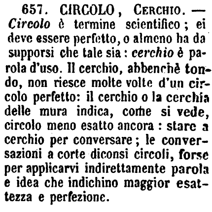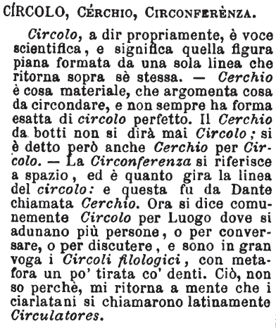 | Circolo, Cerchio, Circonferenza - Circolo, a dir propriamente, è voce scientifica, e significa quella figura piana formata da una sola linea che ritorna sopra sè stessa. - Cerchio è cosa materiale, che argomenta cosa da circondare, e non sempre ha forma esatta di circolo perfetto. Il Cerchio da botti non si dirà mai Circolo; si è detto però anche Cerchio per Circolo. - La Circonferenza si riferisce a spazio, ed è quanto gira la linea del circolo: e questa fu da Dante chiamata Cerchio. Ora si dice comunemente Circolo per Luogo dove si adunano più persone, o per conversare, o per discutere, e sono in gran voga i Circoli filologici, con metafora un po' tirata co' denti. Ciò, non so perchè, mi ritorna a mente che i ciarlatani si chiamarono latinamente Circulatores. [immagine] |