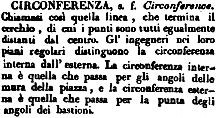Circonferenza - s. f. Circonference. Chiamasi così quella linea, che termina il cerchio, di cui i punti sono tutti egualmente distanti dal centro. Gl'ingegneri nei loro piani regolari distinguono la circonferenza interna dall'esterna. La circonferenza interna è quella che passa per gli angoli delle mura della piazza, e la circonferenza esterna è quella che passa per la punta degli angoli dei bastioni. [immagine]