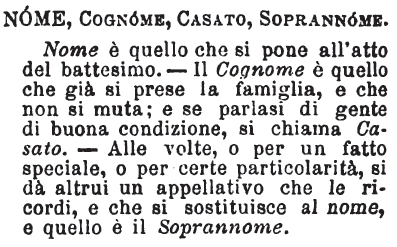 | Nome, Cognome, Casato, Soprannome - Nome è quello che si pone all'atto del battesimo. - Il Cognome è quello che già si prese la famiglia, e che non si muta; e se parlasi di gente di buona condizione, si chiama Casato. - Alle volte, o per un fatto speciale, o per certe particolarità, si dà altrui un appellativo che le ricordi, e che si sostituisce al nome, e quello è il Soprannome. [immagine] |