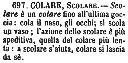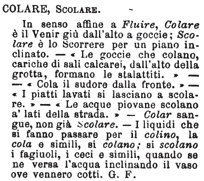 Colare, Scolare - In senso affine a Fluire, Colare è il Venir giù dall'alto a goccie; Scolare è lo scorrere per un piano inclinato. - «Le goccie che colano, cariche di sali calcarei, dall'alto della grotta, formano le stalattiti.» - «Cola il sudore dalla fronte.» - «I piatti lavati si lasciano a scolare.» - «Le acque piovane scolano a' lati della strada.» - Colar sangue, non già Scolare. - I liquidi che si fanno passare per il colino, la cola e simili, si colano; si scolano i fagiuoli, i ceci e simili, quando se ne versa l'acqua inclinando il vaso ove vennero cotti. G. F. [immagine]