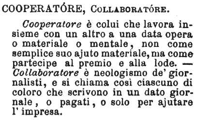 | Cooperatore, Collaboratore - Cooperatore è colui che lavora insieme con un altro a una data opera o materiale o mentale, non come semplice suo ajuto materiale, ma come partecipe al premio e alla lode. - Collaboratore è neologismo de' giornalisti, e si chiama così ciascuno di coloro che scrivono in un dato giornale, o pagati, o solo per ajutare l'impresa. [immagine] |