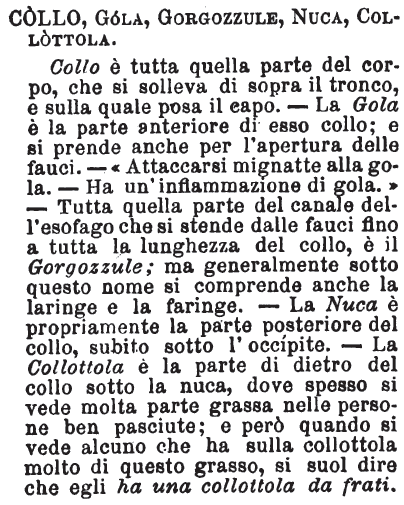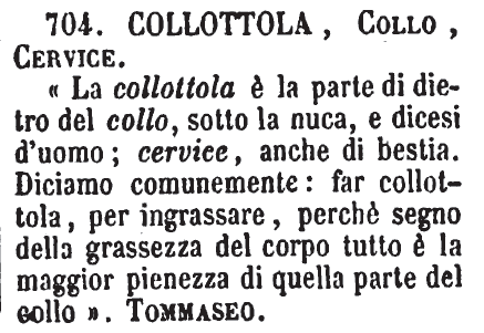 | Collottola, Collo, Cervice - «La collottola è la parte di dietro del collo, sotto la nuca, e dicesi d'uomo; cervice, anche di bestia. Diciamo comunemente: far collottola, per ingrassare, perchè segno della grassezza del corpo tutto è la maggior pienezza di quella parte del collo». Tommaseo. [immagine] |