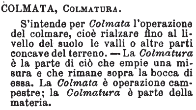 Colmata, Colmatura - S'intende per Colmata l'operazione del colmare, cioè rialzare fino al livello del suolo le valli o altre parti concave del terreno. - La Colmatura è la parte di ciò che empie una misura e che rimane sopra la bocca di essa. La Colmata è operazione campestre; la Colmatura è parte della materia. [immagine]
