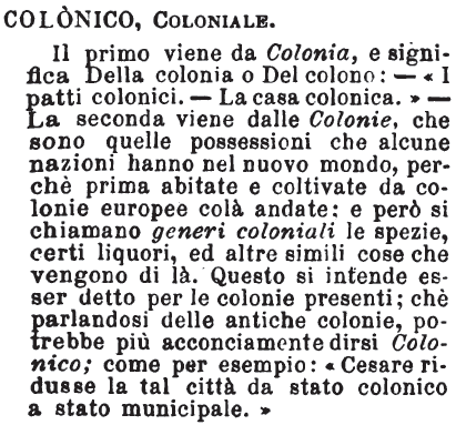 Colonico, Coloniale - Il primo viene da Colonia, e significa Della colonia o Del colono: - «I patti colonici. - La casa colonica.» - La seconda viene dalle Colonie, che sono quelle possessioni che alcune nazioni hanno nel nuovo mondo, perchè prima abitate e coltivate da colonie europee colà andate; e però si chiamano generi coloniali le spezie, certi liquori, ed altre simili cose che vengono di là. Questo si intende esser detto per le colonie presenti; chè parlandosi delle antiche colonie, potrebbe più acconciamente dirsi Colonico; come per esempio: «Cesare ridusse la tal città da stato colonico a stato municipale.» [immagine]