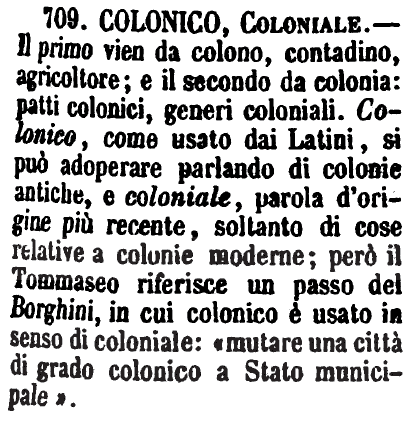 Colonico, Coloniale - Il primo vien da colono, contadino, agricoltore; e il secondo da colonia: patti colonici, generi coloniali. Colonico, come usato dai Latini, si può adoperare parlando di colonie antiche, e coloniale, parola d'origine più recente, soltanto di cose relative a colonie moderne; però il Tommaseo riferisce un passo del Borghini, in cui colonico è usato in senso coloniale: «mutare una città di grado colonico a Stato municipale». [immagine]