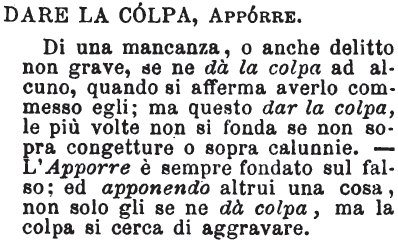 | Accusare, Imputare, Apporre, Dare la colpa, Incolpare - Accusare è il Denunziare apertamente, o appresso il tribunale o appresso i superiori. - Imputare è Attribuire ad alcuno una colpa o un delitto, o di atto o di volontà. - L'Apporre è parimente Attribuire ad altri una colpa; ma senza fondamento certo. - «Lo apposero a lui, ma era innocente.» - Incolpare e Dare la colpa è lo stesso; ma può anche farsi per via di semplice e lieve congettura. [immagine] |