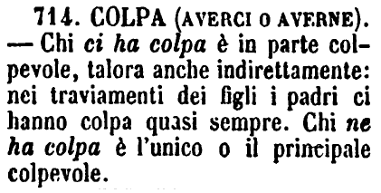 | Colpa (averci o averne) - Chi ci ha colpa è in parte colpevole, talora anche indirettamente: nei traviamenti dei figli i padri ci hanno colpa quasi sempre. Chi ne ha colpa è l'unico o il principale colpevole. [immagine] |