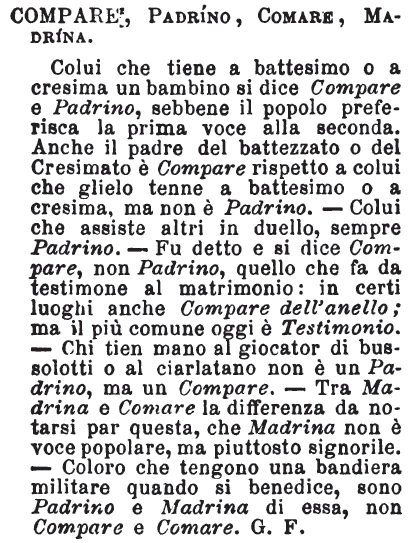 Compare, Padrino, Comare, Madrina - Colui che tiene a battesimo o a cresima un bambino si dice Compare e Padrino, sebbene il popolo preferisca la prima voce alla seconda. Anche il padre del battezzato o del Cresimato è Compare rispetto a colui che glielo tenne a battesimo o a cresima, ma non è Padrino. - Colui che assiste altri in duello, sempre Padrino. - Fu detto e si dice Compare, non Padrino, quello che fa da testimone al matrimonio: in certi luoghi anche Compare dell'anello; ma il più comune oggi è Testimonio. - Chi tien mano al giocator di bussolotti o al ciarlatano non è un Padrino, ma un Compare. - Tra Madrina e Comare la differenza da notarsi par questa, che Madrina non è voce popolare, ma piuttosto signorile. - Coloro che tengono una bandiera militare quando si benedice, sono Padrino e Madrina di essa, non Compare e Comare. G. F. [immagine]