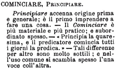 Cominciare, Principiare, Imprendere, Intraprendere - La frase che dice: «bisogna cominciare dal principio» spiega la differenza delle due voci: il primo principio si direbbe, e si dice; il primo cominciamento, no: poi principiare non si principia che una sola volta, cominciare si può molte, ond'è che ricominciare si dice, e riprincipiare non può dirsi, perchè illogico: principio inoltre è regola o norma e perciò sovente origine di molte nostre azioni, illazioni e giudizii: cominciamento non ha questo senso. Imprendere è cominciare l'impresa, o cosa assai considerevole che impresa possa dirsi: è un cominciare se non con apparato, certo con preparativi proporzionati al merito della cosa. Per intraprendere molte volte non è neanche d'uopo di cominciare, basta l'ideare, il proporre qualche impresa: uomo intraprendente non dicesi chi più intraprende, ma chi ha più inclinazione, genio, alacrità e talento atto a ciò fare. [immagine]