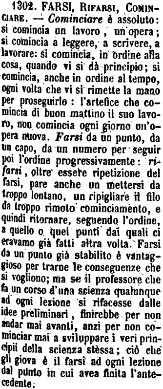 Farsi, Rifarsi, Cominciare - Cominciare è assoluto: si comincia un lavoro, un'opera; si comincia a leggere, a scrivere, a lavorare: si comincia, in ordine alla cosa, quando vi si dà principio; si comincia, anche in ordine al tempo, ogni volta che vi si rimette la mano per proseguirlo: l'artefice che comincia di buon mattino il suo lavoro, non comincia ogni giorno un'opera nuova. Farsi da un punto, da un capo, da un numero per seguir poi l'ordine progressivamente: rifarsi, oltre essere ripetizione del farsi, pare anche un mettersi da troppo lontano, un ripigliare il filo da troppo rimoto cominciamento, e quindi ritornare, seguendo l'ordine, a quello o quei punti dai quali ci eravano già fatti altra volta. Farsi da un punto già stabilito è vantaggioso per trarne le conseguenze che si vogliono; ma se il professore che fa un corso d'una scienza qualunque ad ogni lezione si rifacesse dalle idee preliminari, finirebbe per non andar mai avanti, anzi per non cominciar mai a sviluppare i veri principii della scienza stessa; ciò che gli giova è il farsi ad ogni lezione dal punto in cui avea finita l'antecedente. [immagine]