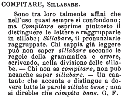 | Compitare, Sillabare - Sono tra loro talmente affini che nell'uso quasi sempre si confondono; ma Compitare esprime piuttosto il distinguere le lettere e raggrupparle in sillabe; Sillabare, il pronunziarle raggruppate. Chi sappia già leggere può non saper sillabare secondo le regole della grammatica e errare, scrivendo, nella divisione delle sillabe. - Chi non sa compitare, non può neanche saper sillabare. - Un cantante che accenta e distingue a dovere tutte le parole sillaba bene; non si direbbe che cómpita bene. G. F. [immagine] |
