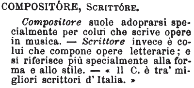 | Compositore, Scrittore - Compositore suole adoprarsi specialmente per colui che scrive opere in musica. - Scrittore invece è colui che compone opere letterarie; e si riferisce più specialmente alla forma e allo stile. - «il C. è tra' migliori scrittori d’Italia.» [immagine] |