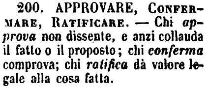 Approvare, Confermare, Ratificare - Chi approva non dissente, e anzi collauda il fatto o il proposto; chi conferma comprova; chi ratifica dà valore legale alla cosa fatta. [immagine]