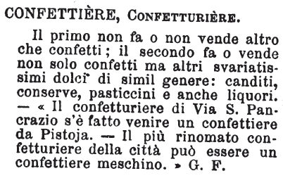 Confettiere, Confetturiere - Il primo non fa o non vende altro che confetti; il secondo fa o vende non solo confetti ma altri svariatissimi dolci di simil genere: canditi, conserve, pasticcini e anche liquori. - «Il confetturiere di via S. Pancrazio s'è fatto venire un confettiere da Pistoja. - Il più rinomato confetturiere della città può essere un confettiere meschino.» G. F. [immagine]