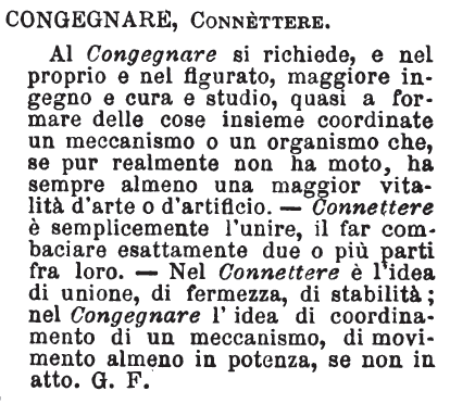 | Congegnare, Connettere - Al Congegnare si richiede, e nel proprio e nel figurato, maggiore ingegno e cura e studio, quasi a formare delle cose insieme coordinate un meccanismo o un organismo che, se pur realmente non ha moto, ha sempre almeno una maggior vitalità d'arte o d'artificio. - Connettere è semplicemente l'unire, il far combaciare esattamente due o più parti fra loro. - Nel Connettere è l'dea di unione, di fermezza, di stabilità; nel Congegnare l'idea di coordinamento di un meccanismo, di movimento almeno in potenza, se non in atto. G.F. [immagine] |