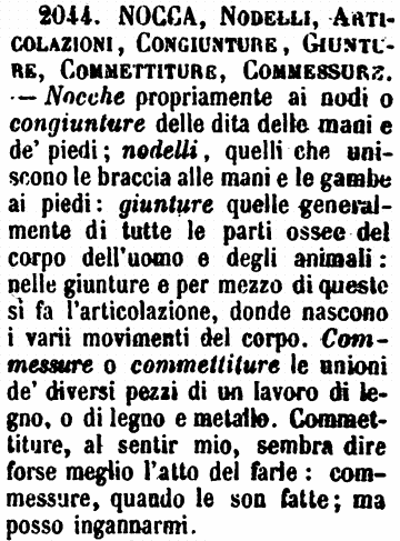 | Nocca, Nodelli, Articolazioni, Congiunture, Giunture, Commettiture, Commessure - Nocche propriamente ai nodi o congiunture delle dita delle mani e de' piedi; nodelli, quelli che uniscono le braccia alle mani e le gambe ai piedi: giunture quelle generalmente di tutte le parti ossee del corpo dell'uomo e degli animali: nelle giunture e per mezzo di queste si fa l'articolazione, donde nascono i varii movimenti del corpo. Commessure o commettiture le unioni de' diversi pezzi di un lavoro di legno, o di legno e metallo. Commettiture, al sentir mio, sembra dire forse meglio l'atto del farle: commessure, quando le son fatte; ma posso ingannarmi. [immagine] |