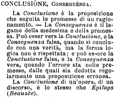 Conclusione, Conseguenza - La Conclusione è la proposizione che seguita le premesse di un ragionamento. - La Conseguenza è il legame della medesima e della premessa. Può esser vera la Conclusione, e la Conseguenza falsa, quando si conclude con una verità, ma la forma logica non è rispettata; e può essere la Conclusione falsa, e la Conseguenza vera, quando l'errore sta nelle premesse, dalle quali sia dedotta regolarmente una proposizione erronea.