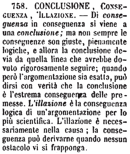 Conclusione, Conseguenza, Illazione - Di conseguenza in conseguenza si viene a una conclusione; ma non sempre le conseguenze son giuste, pienamente logiche, e allora la conclusione devia da quella linea che avrebbe dovuto rigorosamente seguire; quando però l'argomentazione sia esatta, può dirsi con verità che la conclusione è l'estrema conseguenza delle premesse. L'illazione è la conseguenza logica di un'argomentazione per lo più scientifica. L'illazione è necessariamente nella causa; la conseguenza può derivarne quando nessun ostacolo vi si frapponga. [immagine]
