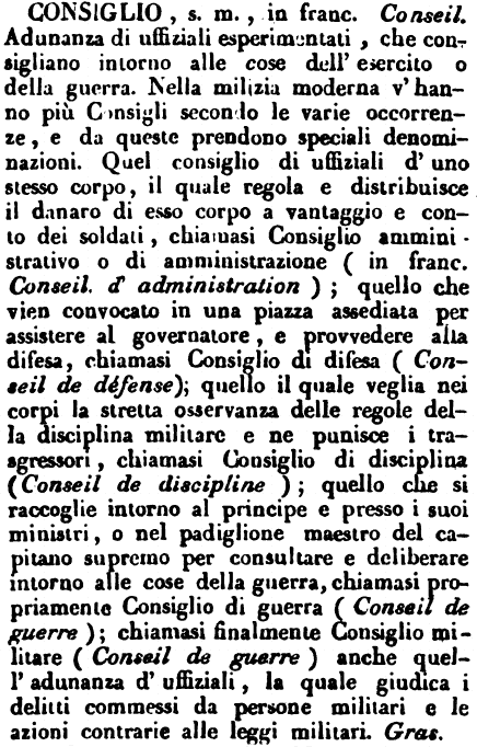 Consiglio - s. m., in franc. Conseil. Adunanza di uffiziali esperimentati, che consigliano intorno alle cose dell'esercito o della guerra. Nella milizia moderna v'hanno più Consigli secondo le varie occorrenze, e da queste prendono speciali denominazioni. Quel consiglio di uffiziali d'uno stesso corpo, il quale regola e distribuisce il danaro di esso corpo a vantaggio e conto dei soldati, chiamasi Consiglio amministrativo o di amministrazione (in franc. Conseil d'administration); quello che vien convocato in una piazza assediata per assistere al governatore, e provvedere alla difesa, chiamasi Consiglio di difesa (Conseil de défense); quello il quale veglia nei corpi la stretta osservanza delle regole della disciplina militare e ne punisce i trasgressori, chiamasi Consiglio di disciplina (Conseil de discipline); quello che si raccoglie intorno al principe e presso i suoi ministri, o nel padiglione maestro del capitano supremo per consultare e deliberare intorno alle cose della guerra, chiamasi propriamente Consiglio di guerra (Conseil de guerre); chiamasi finalmente Consiglio militare (Conseil de guerre) anche quell'adunanza d'uffiziali, la quale giudica i delitti commessi da persone militari e le azioni contrarie alle leggi militari. Gras. [immagine]