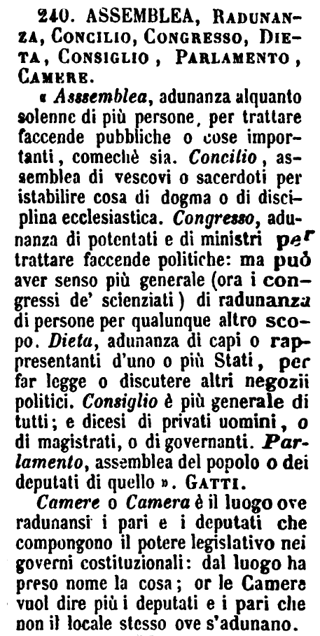 Assemblea, Radunanza, Concilio, Congresso, Dieta, Consiglio, Parlamento, Camere - «Assemblea, adunanza alquanto solenne di più persone, per trattare faccende pubbliche o cose importanti, comechè sia. Concilio, assemblea di vescovi o sacerdoti per istabilire cosa di dogma o di disciplina ecclesiastica. Congresso, adunanza di potentati e di ministri per trattare faccende politiche: ma può aver senso più generale (ora i congressi de' scienziati) di radunanza di persone per qualunque altro scopo. Dieta, adunanza di capi o rappresentanti d'uno o più Stati, per far legge o discutere altri negozii politici. Consiglio è più generale di tutti; e dicesi di privati uomini, o di magistrati, o di governanti. Parlamento, assemblea del popolo o dei deputati di quello». Gatti.