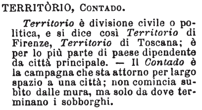 Territorio, Contado - Territorio è divisione civile o politica, e si dice così Territorio di Firenze, Territorio di Toscana; è per lo più parte di paese dipendente da città principale. - Il Contado è la campagna che sta attorno per largo spazio a una città; non comincia subito dalle mura, ma solo da dove terminano i sobborghi. [immagine]