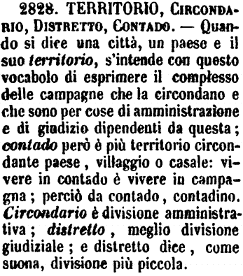 Territorio, Circondario, Distretto, Contado - Quando si dice una città, un paese e il suo territorio, s'intende con questo vocabolo di esprimere il complesso delle campagne che la circondano e che sono per cose di amministrazione e di giudizio dipendenti da questa; contado però è più territorio circondante paese, villaggio o casale: vivere in contado è vivere in campagna; perciò da contado, contadino. Circondario è divisione amministrativa; distretto, meglio divisione giudiziale; e distretto dice, come suona, divisione più piccola. [immagine]