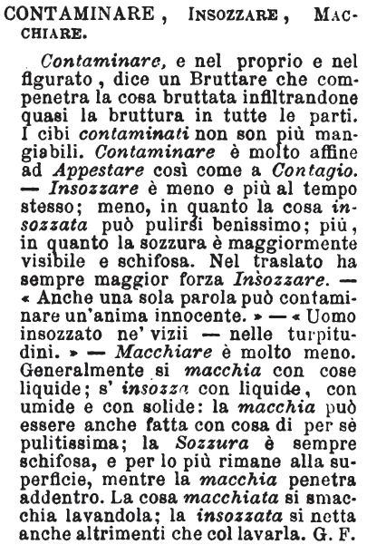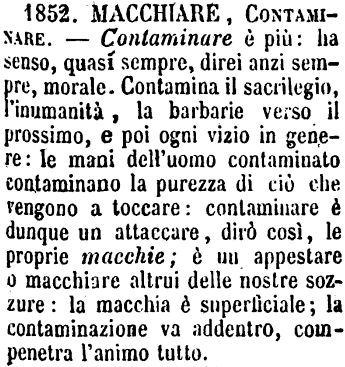 | Macchiare, Contaminare - Contaminare è più: ha senso, quasi sempre, direi anzi sempre, morale. Contamina il sacrilegio, l'umanità, la barbarie verso il prossimo, e poi ogni vizio in genere: le mani dell'uomo contaminato contaminano la purezza di ciò che vengono a toccare: contaminare è dunque un attaccare, dirò così, le macchie; è un appestare o macchiare altrui delle nostre sozzure: la macchia è superficiale, la contaminazione va addentro, compenetra l'animo tutto. [immagine] |