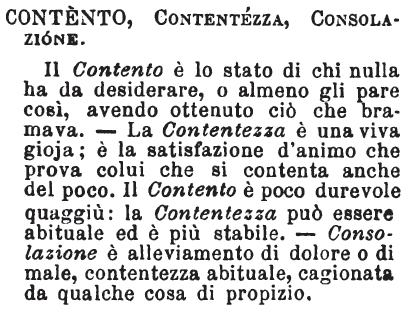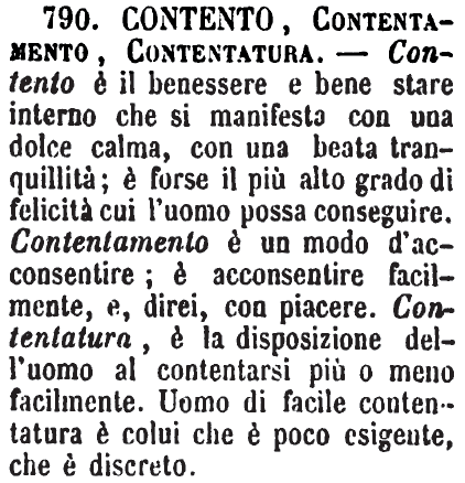 | Felicità, Contento, Contentezza, Letizia - La Felicità è il puro astratto della parola Felice. - Il Contento è la interna satisfazione dell'animo che nulla desidera. - La Contentezza è la significazione esteriore del contento. - La Letizia è la contentezza significata con parole, con atti e con ogni dimostrazione. [immagine] |