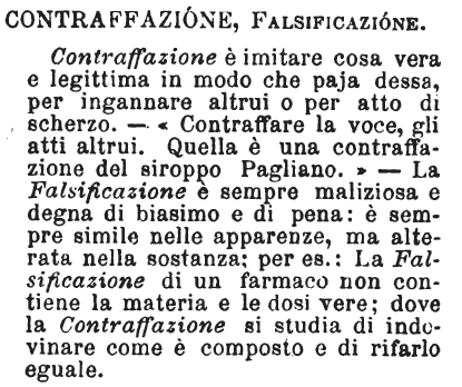 | Contraffazione, Falsificazione - Contraffazione è imitare cosa vera e legittima in modo che paja dessa, per ingannare altrui o per atto di scherzo. - «Contraffare la voce, gli atti altrui. Quella è una contraffazione del siroppo Pagliano.» - La Falsificazione è sempre maliziosa e degna di biasimo e di pena: è sempre simile nelle apparenze, ma alterata nella sostanza; per es.: La Falsificazione di un farmaco non contiene la materia e le dosi vere; dove la Contraffazione si studia di indovinare come è composto e di rifarlo eguale. [immagine] |