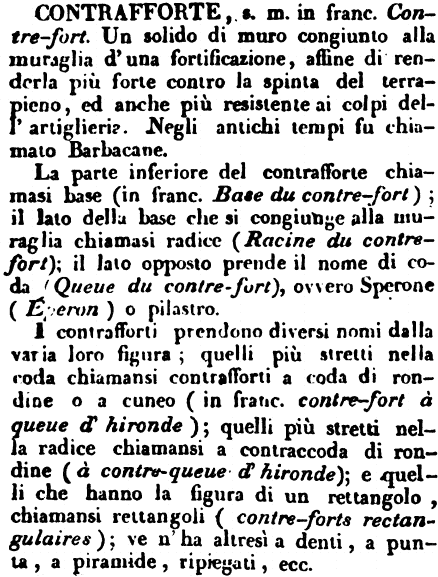 Contrafforte - s. m. in franc. Contre-fort. Un solido di muro congiunto alla muraglia d'una fortificazione, affine di renderla più forte contro la spinta del terrapieno, ed anche più resistente ai colpi dell'artiglieria. Negli antichi tempi fu chiamato Barbacane.