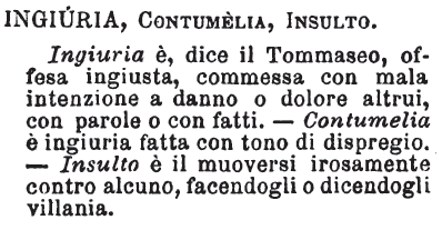 | Ingiuria, Contumelia, Insulto - Ingiuria è, dice il Tommaseo, offesa ingiusta, commessa con mala intenzione a danno o dolore altrui, con parole o con fatti. - Contumelia è ingiuria fatta con tono di dispregio. - Insulto è il muoversi irosamente contro alcuno, facendogli o dicendogli villania. [immagine] |