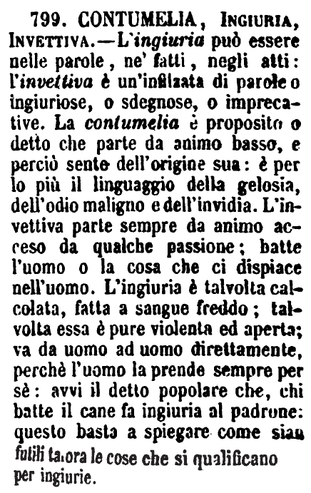 | Contumelia, Ingiuria, Invettiva - L'ingiuria può essere nelle parole, ne' fatti, negli atti: l'invettiva è un'infilzata di parole o ingiuriose, o sdegnose, o imprecative. La contumelia è proposito o detto che parte da animo basso, e perciò sente dell'origine sua: è per lo più il linguaggio della gelosia, dell'odio maligno e dell'invidia. L'invettiva parte sempre da animo acceso da qualche passione; batte l'uomo o la cosa che ci dispiace nell'uomo. L'ingiuria è talvolta calcolata, fatta a sangue freddo; talvolta essa è pure violenta ed aperta; va da uomo ad uomo direttamente, perchè l'uomo la prende sempre per sè: avvi il detto popolare che, chi batte il cane fa ingiuria al padrone: questo basta a spiegare come sian futili talora le cose che si qualificano per ingiurie. [immagine] |