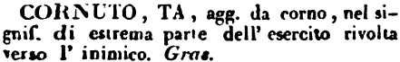 | Cornuto, ta - agg. da corno, nel signif. di estrema parte dell'esercito rivolta verso l'inimico. Gras. [immagine] |