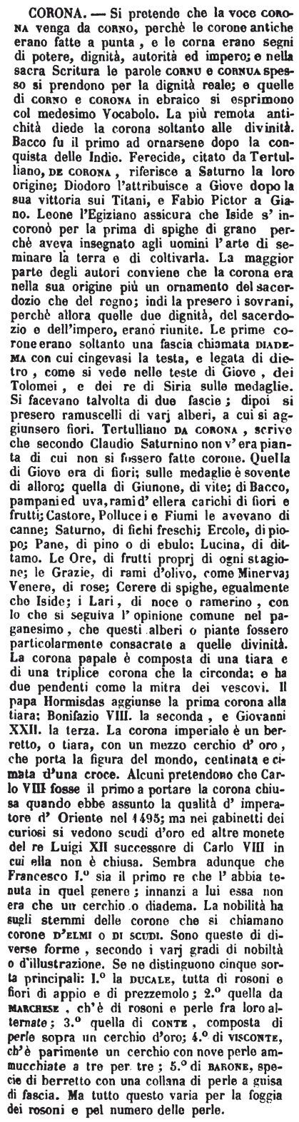 Corona - Si pretende che la voce corona venga da corno, perchè le corone antiche erano fatte a punta, e le corna erano segni di potere, dignità, autorità ed impero; e nella sacra Scritura le parole cornu e cornua spesso si prendono per la dignità reale; e quelle di corno e corona in ebraico si esprimono col medesimo Vocabolo. La più remota antichità diede la corona soltanto alle divinità. Bacco fu il primo ad ornarsene dopo la conquista delle Indie. Ferecide, citato da Tertulliano, de corona, riferisce a Saturno la loro origine; Diodoro l’attribuisce a Giove dopo la sua vittoria sui Titani, e Fabio Pictor a Giano. Leone l’Egiziano assicura che Iside s’incoronò per la prima di spighe di grano perchè aveva insegnato agli uomini l’arte di seminare la terra e di coltivarla. La maggior parte degli autori conviene che la corona era nella sua origine più un ornamento del sacerdozio che del regno; indi la presero i sovrani, perchè allora quelle due dignità, del sacerdozio e dell’impero, erano riunite. Le prime corone erano soltanto una fascia chiamata diadema con cui cingevasi la testa, e legata di dietro, come si vede nelle teste di Giove, dei Tolomei, e dei re di Siria sulle medaglie. Si facevano talvolta di due fascie; dipoi si presero ramuscelli di varj alberi, a cui si aggiunsero fiori. Tertulliano da corona, scrive che secondo Claudio Saturnino non v’era pianta di cui non si fossero fatte corone. Quella di Giove era di fiori; sulle medaglie è sovente di alloro; quella di Giunone, di vite; di Bacco, pampani ed uva, rami d’ellera carichi di fiori e frutti; Castore, Pollucei e Fiumi le avevano di canne; Saturno, di fichi freschi; Ercole, di piopo; Pane, di pino o di ebulo; Lucina, di dittamo. Le Ore, di frutti proprj di ogni stagione; le Grazie, di rami d’olivo, come Minerva; Venere, di rose; Cerere di spighe, egualmente che Iside; i Lari, di noce o ramerino, con lo che si seguiva l’opinione comune nel paganesimo, che questi alberi o piante fossero particolarmente consacrate a quelle divinità. La corona papale è composta di una tiara e di una triplice corona che la circonda: e ha due pendenti come la mitra dei vescovi. Il papa Hormisdas aggiunse la prima corona alla tiara: Bonifazio VIII. la seconda, e Giovanni XXII. la terza. La corona imperiale è un berretto, o tiara, con un mezzo cerchio d’oro, che porta la figura del mondo, centinata e cimata d’una croce. Alcuni pretendono che Carlo VIII fosse il primo a portare la corona chiusa quando ebbe assunto la qualità d’imperatore d’Oriente nel 1495; ma nei gabinetti dei curiosi si vedono scudi d’oro ed altre monete del re Luigi XII successore di Carlo VIII in cui ella non è chiusa. Sembra adunque che Francesco I.° sia il primo re che l’abbia tenuta in quel genere; innanzi a lui essa non era che un cerchio o diadema. La nobiltà ha sugli stemmi delle corone che si chiamano corone d’elmi o di scudi. Sono queste di diverse forme, secondo i varj gradi di nobiltà o d’illustrazione. Se ne distinguono cinque sorta principali: 1.° la ducale, tutta di rosoni e fiori di appio e di prezzemolo; 2.° quella da marchese, ch’è di rosoni e perle fra loro alternate; 3.° quella di conte, composta di perle sopra un cerchio d’oro; 4.° di visconte, ch’è parimente un cerchio con nove perle ammucchiate a tre per tre; 5.° di barone, specie di berretto con una collana di perle a guisa di fascia. Ma tutto questo varia per la foggia dei rosoni e pel numero delle perle. [immagine]