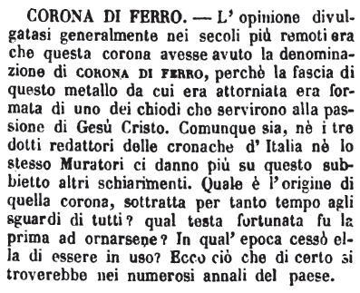 Corona di ferro - L'opinione divulgatasi generalmente nei secoli più remoti era che questa corona avesse avuto la denominazione di corona di ferro, perchè la fascia di questo metallo da cui era attorniata era formata di uno dei chiodi che servirono alla passione di Gesù Cristo. Comunque sia, nè i tre dotti redattori delle cronache d'Italia nè lo stesso Muratori ci danno più su questo subbietto altri schiarimenti. Quale è l'origine di quella corona, sottratta per tanto tempo agli sguardi di tutti? qual testa fortunata fu la prima ad ornarsene? In qual'epoca cessò ella di essere in uso? Ecco ciò che di certo si troverebbe nei numerosi annali del paese. [immagine]