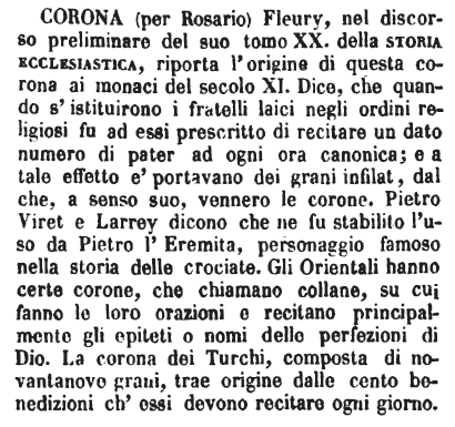 Corona (per Rosario) - Fleury, nel discorso preliminare del suo tomo XX. della storia ecclesiastica, riporta l'origine di questa corona ai monaci del secolo XI. Dice, che quando s'istituirono i fratelli laici negli ordini religiosi fu ad essi prescritto di recitare un dato numero di pater ad ogni ora canonica; e a tale effetto e' portavano dei grani infilat, dal che, a senso suo, vennero le corone. Pietro Viret e Larrey dicono che ne fu stabilito l'uso da Pietro l'Eremita, personaggio famoso nella storia delle crociate. Gli Orientali hanno certe corone, che chiamano collane, su cui fanno le loro orazioni e recitano principalmente gli epiteti o nomi delle perfezioni di Dio. La corona dei Turchi, composta di novantanove grani, trae origine dalle cento benedizioni ch'essi devono recitare ogni giorno. [immagine]