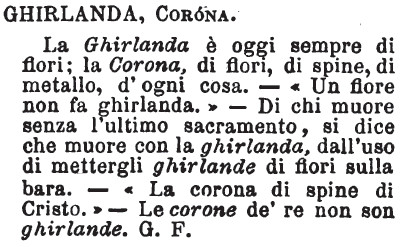 Ghirlanda, Corona - La Ghirlanda è oggi sempre di fiori; la Corona, di fiori, di spine, di metallo, d'ogni cosa. - « Un fiore non fa ghirlanda. » - Di chi muore senza l'ultimo sacramento, si dice che muore con la ghirlanda, dall'uso di mettergli ghirlande di fiori sulla bara. - « La corona di spine di Cristo. » - Le corone de' re non son ghirlande. G. F. [immagine]