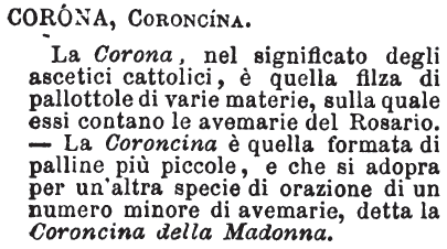 Corona, Coroncina - La Corona, nel significato degli ascetici cattolici, è quella filza di pallottole di varie materie, sulla quale essi contano le avemarie del Rosario. - La Coroncina è quella formata di palline più piccole, e che si adopra per un'altra specie di orazione di un numero minore di avemarie, detta la Coroncina della Madonna. [immagine]