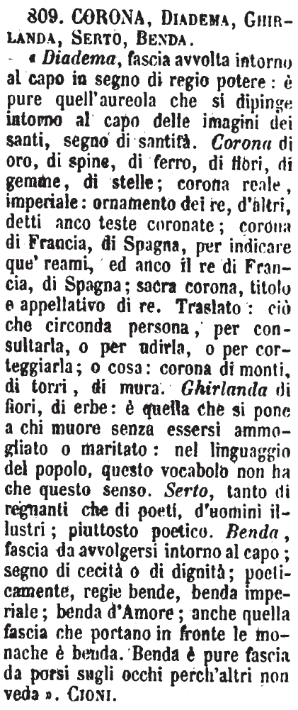 Corona, Diadema, Ghirlanda, Serto, Benda - « Diadema, fascia avvolta intorno al capo in segno di regio potere: è pure quell'aureola che si dipinge intorno al capo delle imagini dei santi, segno di santità. Corona di oro, di spine, di ferro, di fiori, di gemme, di stelle; corona reale, imperiale: ornamento dei re, d'altri, detti anco teste coronate; corona di Francia, di Spagna, per indicare que' reami, ed anco il re di Francia, di Spagna; sacra corona, titolo e appellativo di re. Traslato: ciò che circonda persona, per consultarla, o per udirla, o per corteggiarla; o cosa: corona di monti, di torri, di mura. Ghirlanda di fiori, di erbe: è quella che si pone a chi muore senza essersi ammogliato o maritato: nel linguaggio del popolo, questo vocabolo non ha che questo senso. Serto, tanto di regnanti che di poeti, d'uomini illustri; piuttosto poetico. Benda, fascia da avvolgersi intorno al capo; segno di cecità o di dignità; poeticamente, regie bende, benda imperiale; benda d'Amore; anche quella fascia che portano in fronte le monache è benda. Benda è pure fascia da porsi sugli occhi perch'altri non veda ». Cioni. [immagine]