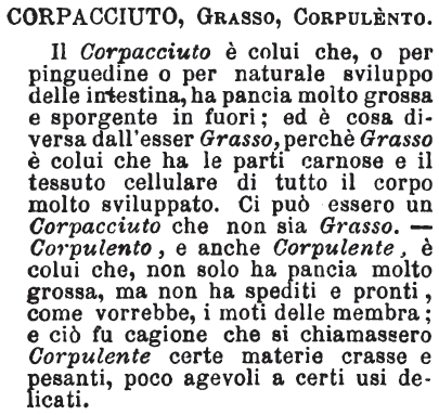 Corpacciuto, Grasso, Corpulento - Il Corpacciuto è colui che, o per pinguedine o per naturale sviluppo delle intestina, ha pancia molto grossa e sporgente in fuori; ed è cosa diversa all'esser Grasso, perchè Grasso è colui che ha le parti carnose e il tessuto cellulare di tutto il corpo molto sviluppato. Ci può essere un Corpacciuto che non sia Grasso. - Corpulento, e anche Corpulente, è colui che, non solo ha pancia molto grossa, ma non ha spediti e pronti, come vorrebbe, i moti delle membra; e ciò fu cagione che si chiamassero Corpulente certe materie crasse e pesanti, poco agevoli a certi usi delicati. [immagine]
