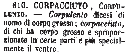 Corpacciuto, Corpulento - Corpulento dicesi di uomo di corpo grosso; corpacciuto, di chi ha corpo grosso e sproporzionato in certe parti e più specialmente il ventre. [immagine]