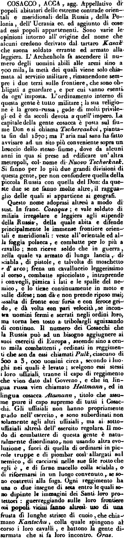 Questo nome adoprasi altresì a modo di sust. In franc. Cosaque; e vale soldato di milizia irregolare e leggiera agli stipendi della Russia, della quale abita e difende principalmente le immense frontiere orientali e meridionali: veste all'orientale ed alla foggia polacca, e combatte per lo più a cavallo; non riceve soldo che in guerra, nella quale va armato di lunga lancia, di sciabla, di pistole, e talvolta di moschetto e d'arco; frena un cavalluccio leggerissimo al corso, combatte spicciolato, intraprende i convogli, pizzica i lati e le spalle del nemico, e lo tiene continuamente in moto e sulle difese; non dà e non prende riposo mai; assalta di fronte con furia e con feroce grido, e dà volta con pari velocità, se incontra uomini fermi e serrati negli ordini loro, ma torna ben tosto a tribolargli sguizzando di continuo. Il numero dei Cosacchi che la Russia può ad un bisogno aggiugnere ai suoi eserciti di Europa, ascende sino a cento mila combattenti, ordinati in reggimenti che son da essi chiamati Pulk, ciascuno di 500 a 3,000 uomini circa, secondo i luoghi nei quali è levato; scelgono essi stessi i loro uffiziali, tranne il capo di reggimento che vien dato dal Governo, e che in lingua russa vien chiamato Hettmann, ed in lingua cosacca Atamann, titolo che assume pure il capo supremo di tutti i Cosacchi. Gli uffiziali non hanno propriamente grado nell'esercito, e sono subordinati non solamente agli altri uffiziali, ma ai sotto-uffiziali altresì dell'esercito regolare. Il modo di combattere di questa gente è naturalmente disordinato, non usando altra evoluzione, fuori di quella di ordinarsi in piccole truppe e di piombar così allargati sul nemico, di cacciarsi nelle sue file rotto che egli è, e di farne macello colla sciabla, o di riformarsi in un luogo convenuto, se sono costretti alla fuga. Ogni reggimento ha una o due insegne di seta entro le quali sono dipinte le immagini dei Santi loro protettori: guerreggiando sulle loro frontiere coi popoli vicini fanno altresì uso di una frusta di lunghe strisce di cuoio, che chiamano Kantschu, colla quale spingono al corso i loro cavalli, e battono la gente disarmata che si fa loro incontro. Gras. [immagine]