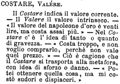 Costare, Valere - Il Costare indica il valore corrente. - Il Valere il valore intrinseco. - «Il valore del napoleone d'oro è venti lire, ma costa assai più.» - Nel Costare c'è l'idea di tanto o quanto di gravezza. - «Costa troppo, e non voglio comprarlo, perchè non vale quel prezzo.» - Ciò è cagione che il Costare si trasporta alla metafora, con idea di sforzo o danno. - «Potei ottenere quella cosa, ma mi costò sudori e dispiaceri.» [immagine]