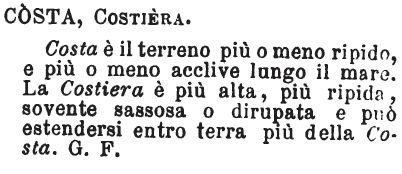| Costa, Costiera - Costa è il terreno più o meno ripido, e più o meno acclive lungo il mare. La Costiera è più alta, più ripida, sovente sassosa o dirupata e può estendersi entro terra più della Costa. G. F. [immagine] |