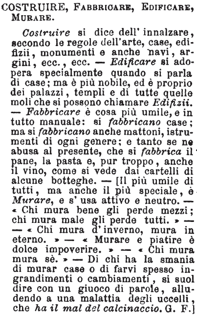 Costruire, Fabbricare, Edificare, Murare - Costruire si dice dell'innalzare, secondo le regole dell'arte, case, edifizii, monumenti e anche navi, argini, ecc., ecc. - Edificare si adopera specialmente quando si parla di case; ma è più nobile, ed è proprio dei palazzi, templi e di tutte quelle moli che si possono chiamare Edifizii. - Fabbricare è cosa più umile, e in tutto manuale: si fabbricano case; ma si fabbricano anche mattoni, istrumenti di ogni genere; e tanto se ne abusa al presente, che si fabbrica il pane, la pasta e, pur troppo, anche il vino, come si vede dai cartelli di alcune botteghe. - [Il più umile di tutti, ma anche il più speciale, è Murare, e s'usa attivo e neutro. - «Chi mura bene gli perde mezzi; chi mura male gli perde tutti.» - «Chi mura d'inverno, mura in eterno.» - «Murare e piatire è dolce impoverire.» - «Chi mura mura sè.» - Di chi ha la smania di murar case o di farvi spesso ingrandimenti o cambiamenti, si suol dire con un giuoco di parole, alludendo a una malattia degli uccelli, che ha il mal del calcinaccio. G. F.] [immagine]