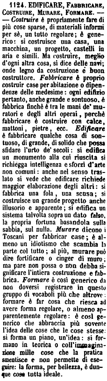 Edificare, Fabbricare, Costruire, Murare, Formare - Costruire è propriamente fare di più cose sparse, di materiali informi per sè, un tutto regolare; è generico: si costruisce una casa, una macchina, un progetto, castelli in aria e simili. Ma costruire, meglio d'ogni altra cosa, si dice delle navi; onde legno da costruzione e buon costruttore. Fabbricare è proprio costruir case per abitazione o dipendenze delle medesime: ogni edifizio pertanto, anche grande e sontuoso, è fabbrica finchè è tra le mani de' muratori e degli altri operai, perchè fabbricare è costruire con calce, mattoni, pietre, ecc. Edificare è fabbricare qualche cosa di sontuoso, di grande, di solido che possa sfidare l'urto de' secoli: si edifica un monumento alla cui riuscita si richiegga intelligenza e sforzi d'arte non comuni: anche nel senso traslato si vede che edificare richiede maggior elaborazione degli altri: si fabbrica una fola, una scusa; si costruisce un grande progetto anche illusorio e apparente; si edifica un sistema talvolta sopra un dato falso, la propria fortuna basandola sulla sabbia, sul nulla. Murare dicono i Toscani per fabbricar case; è almeno un idiotismo che scambia la parte col tutto; al più murare può dire fortificare o cinger di muro; ma pare non possa o non debba significare l'intiera costruzione e fabbrica. Formare è così generico da non doversi registrare in questo gruppo di vocaboli più che altrove: formare è far cosa che riesca ad avere forma regolare, o almeno apparentemente regolare: è così generico che abbraccia più sovente l'idea delle cose che le cose stesse: si forma un piano, un'idea: si formano in teorica o coll'immaginazione mille cose che la pratica smentisce e non permette di eseguire: la forma, per bellezza, è dunque cosa tutta ideale. [immagine]