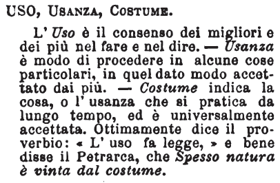 | Uso, Usanza, Costume - L'Uso è il consenso dei migliori e dei più nel fare e nel dire. - Usanza è modo di procedere in alcune cose particolari, in quel dato modo accettato dai più. - Costume indica la cosa, o l'usanza che si pratica da lungo tempo, ed è universalmente accettata. Ottimamente dice il proverbio: «L'uso fa legge,» e bene disse il Petrarca, che Spesso natura è vinta dal costume. [immagine] |