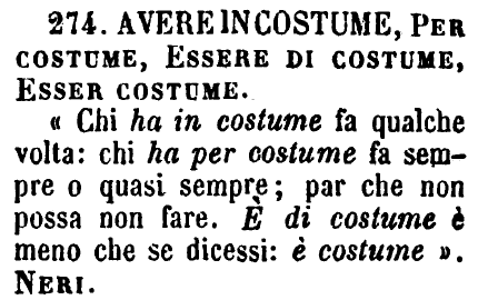 | Avere in costume, Per costume, Essere di costume, Esser costume - «Chi ha in costume fa qualche volta: chi ha per costume fa sempre o quasi sempre; par che non possa non fare. E' di costume è meno che se dicessi: è costume». Neri. [immagine] |